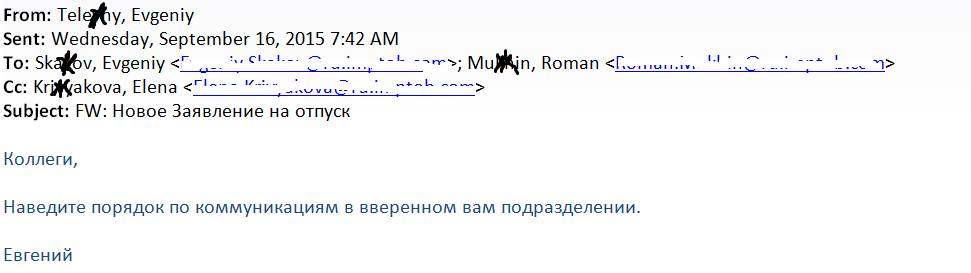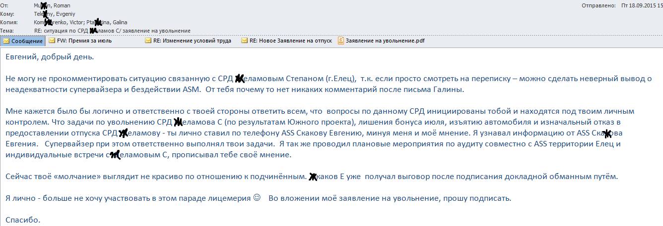 Служба персонала, была уже в теме, так как Степан раздобыл их корпоративные адреса и писал сигналы SOS и заявление на неожиданный отпуск. Как я и предполагал ранее, вопрос из разряда «что вы там устроили?» прилетел из службы персонала центрального офиса бумерангом к моему супервайзеру в копии RSM ТелеЖный Е. И тут Евгений выдаёт фееричный мостик перед Москвой и очередной плевок в свою команду: