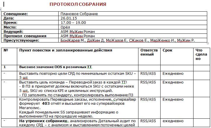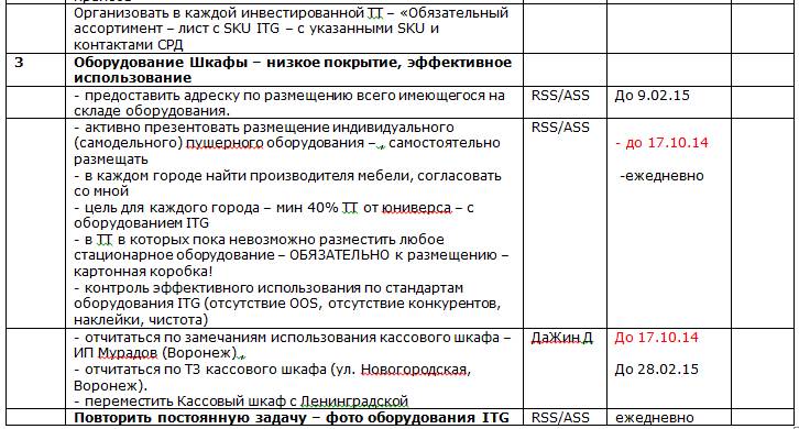 Мой руководитель Евгений ТелеЖный, взрослый и опытный Региональный менеджер, он работал в компании «Империал Жобакко» 8 лет на этой позиции и как раз в конце 2013 года прошли большие изменения по Регионам и ему, в том числе отдали Территорию Черноземья. Вступив в должность, я получил от него короткий обзор по каждому супервайзеру, но при этом меня очень порадовала его позиция, «смотри сам, тебе с ними работать, мне нужен результат». Супер. То, что надо. Договорились, что я не тороплюсь, анализирую, после делаю выводы. Ему импонировал мой подход к управлению территории. Самостоятельность и ответственность! Я делаю предложения – отправляю на согласования, я делаю подробный анализ по периодам или по задачам, сразу прикладываю план действий по направлениям, которые недотягиваем или требуют развития, я провожу все собеседования – по результатам подробное описание по каждому кандидату по компетенциям, знаниям, опыту с предложениями – от него только «Ок». По результатам визитов каждого города – помимо устной обратной связи супервайзеру и команде, обязательно, письмо суперу с копией руководителю, с результатами аудита, планом действий, сроками и ответственными, сканы обсуждённых и подписанных бланков – прилагаются. Я организовал ежемесячные (или 1 раз в 2 месяца) собрания супервайзеров, с обязательной отчётной презентацией каждого по всем бизнес показателям, оценкой выполнения предыдущего протокола, моей обзорной презентацией по территории, совместное согласование направлений по улучшению и развитию. Пример: