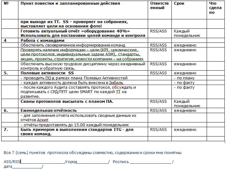 Данные нарушения обсуждены с RSS Жбанковым Евгением. Обращено внимание, что данные несогласованные решения, являются нарушением должностной инструкции Начальника по продажам (супервайзера). Пункта 1 «Объемы продаж по территории» (… Регулировать прибыли и убытки (P&L) на территории, уделяя основное внимание продажам наиболее прибыльных торговых марок при эффективном управлении затратами…) и пункта 4 «Управление ресурсами» (…Эффективно управлять бюджетом торгового маркетинга и административного бюджета на подотчетной территории.).