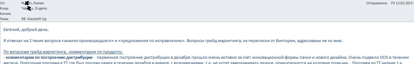 «Изначально было письмо от тебя 5 декабря – ты пересылал письмо В. КомиЖаренко о том что Davidoff UP – заканчивается , необходимо приостановить построение дистрибуции (ниже приложил).