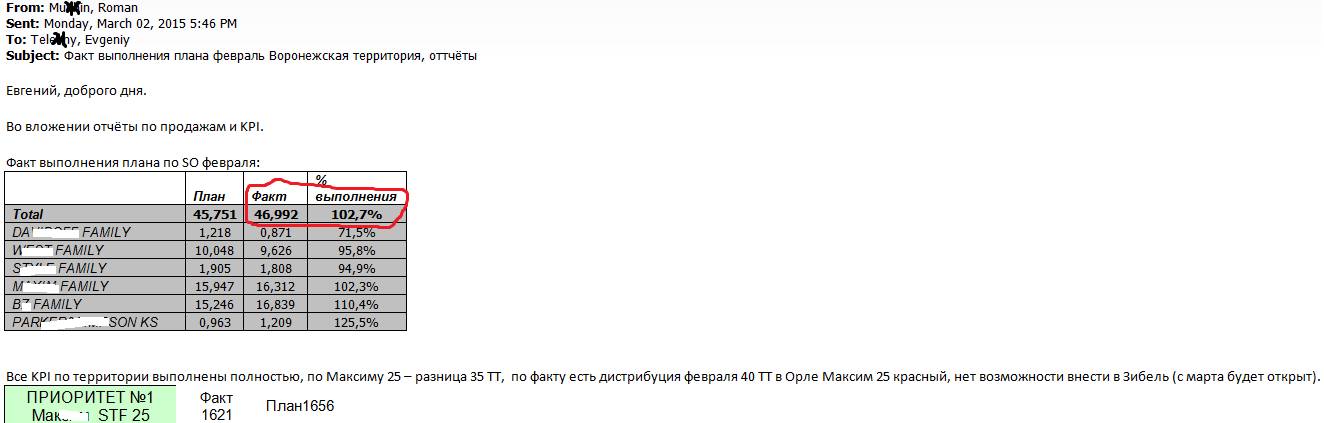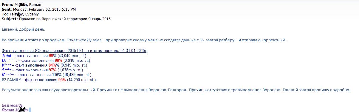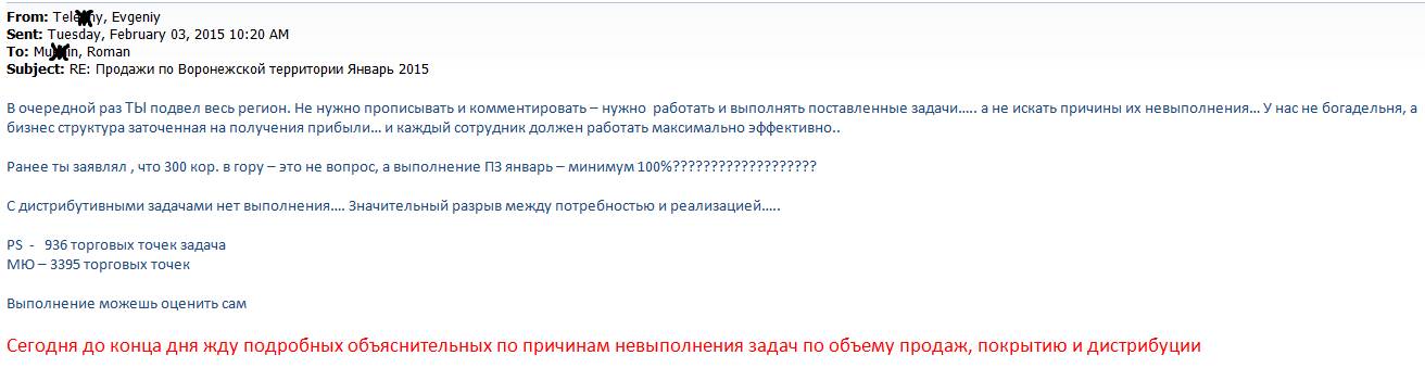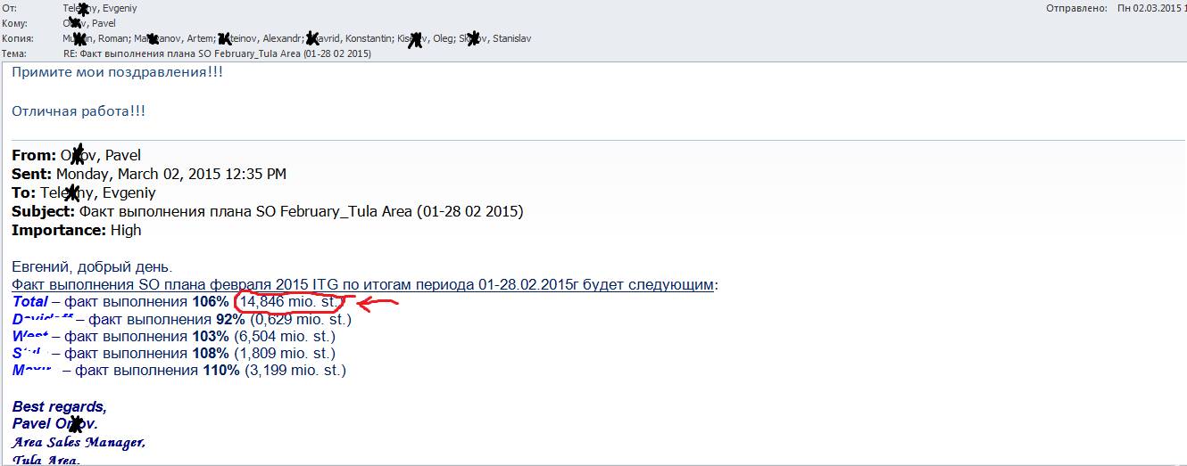 Данные по Туле и МО – молодцы (1 и 2 письмо) – продали 15 и 8 mio. 3 письмо обратная связь для меня – перевыполнение плана и объём в 47 mio – не оценивается – а оценивается дистрибуция по Максим 25 (придраться больше не к чему было). При этом невыполнение создано – игнорированием моих запросов и информации (см письмо 4 и 5)».