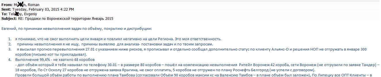 – дополнительный объём который я тебе называл по телефону 30.01 – в размере 80 коробов – пошёл на компенсацию невыполнения Ритейл Воронеж 42 короба, сети Воронеж (не отгрузили по заявке Тандер) – 18 коробов, По Старому Осколу 27 коробов не отгружена заявка Ярыгина, не смог оплатить, 5 коробов не отгружен по плану Роснефть Белгород (не успели с договором).
