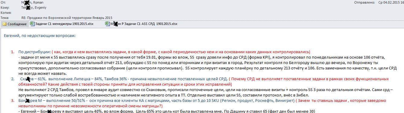 Первый случай. План по продажам не выполнен. Выполнение 99.4%. Что бы была понятна причинно-следственная связь, вся переписка с начала до конца, по конкретному вопросу. На ваш суд.