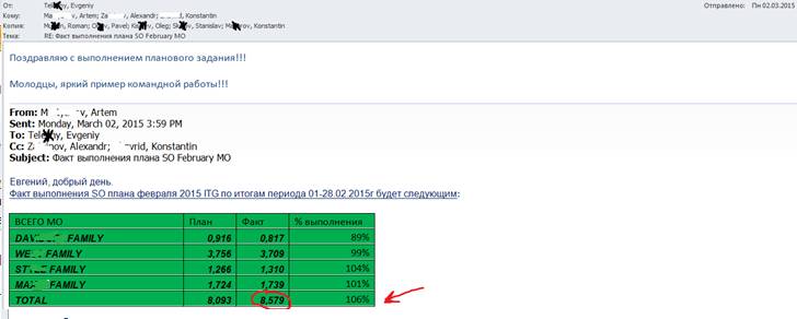 Второй случай. Обратная связь коллегам и мне в отдельных письмах, конкретно по выполнению плана по продажам (SO Total).