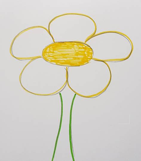 Рисуем с тобой цветок ромашки. Сначала рисуем середину цветка – круг, от него пять больших лепестка. Посмотри, как нарисовала я.