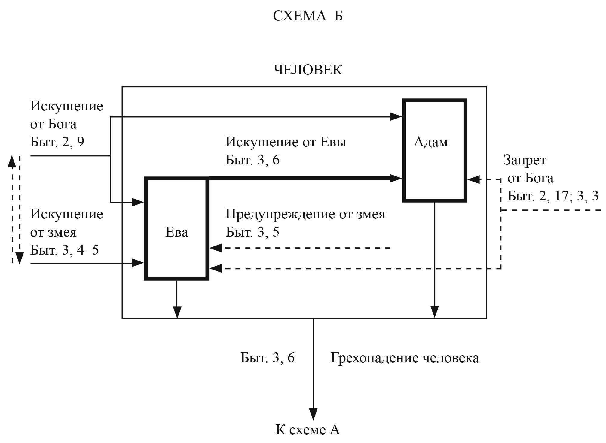 Символ «Человек» представлен на схеме Б в виде двух квадратов – «Адам» и «Ева», объединённых общим контуром. «Динамические составляющие» схемы Б (воздействия, поступки) даны в виде стрелок: сплошных – «склонение к вкушению» и пунктирных – «информация о последствиях вкушения».
