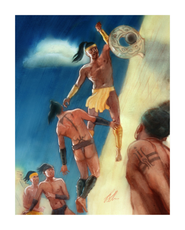 Игра затягивалась, зрители нервничали, игроки устали и ошибались все чаще. Воспользовавшись промахом тикальцев, лучший игрок Копана знаменитый Каменный Локоть, капитан команды, ловко перехватив мяч, несильно посланный кем-то из соперников, мгновенно подбросил его и нанес удар мощной битой. Каучуковый мяч молнией влетел в узкое кольцо тикальцев, на миг застыл и в жуткой тишине замершего стадиона проскочил через него.