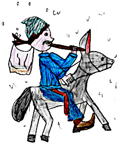 А Назар тую ряднину в´яже на жердину; уламок ржавої шаблюки при боці почепив; в сусіди вислюка поцупив, сів і – з села потріхкотив.