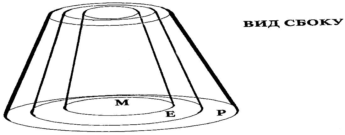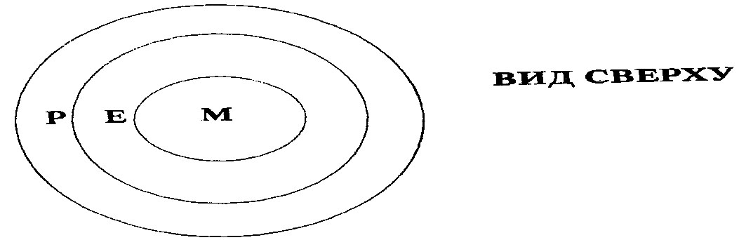 Ж. Витулкас (цит. По Тимошенко И. В.) описывает схему, на которой организм человека представлен тремя уровнями (планами): Ментальным (М), Эмоциональным (Е) и Физическим (Р). Схема представлена в виде конусов (рис.36).