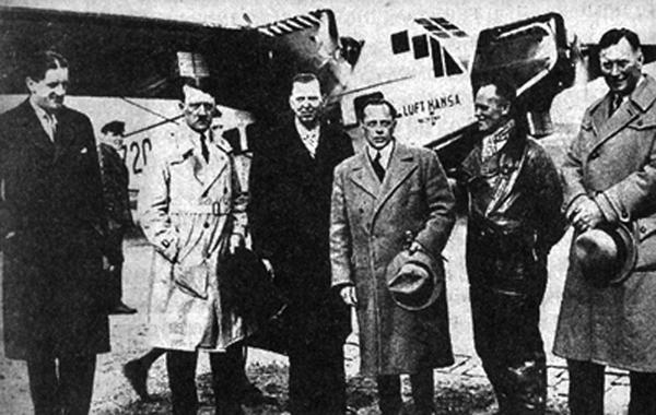Далее у него начались трения с министром образования и пропаганды Геббельсом, и в 1937 г. он тайно выехал в Швейцарию, а затем в Англию. После начала Второй мировой войны Ханфштенгль был интернирован в Канаде, откуда по личному указанию президента США Рузвельта его доставили в США, и до 1944 г. он работал консультантом Вашингтона по вопросам личных взаимоотношений и внутренних событий в нацистской верхушке, а также по вопросам психологического противостояния и геополитики. На снимке Гитлера с группой приближенных на фоне самолета во время избирательной кампании 1932 г. Э. Ханфштенгль, высокий, элегантный мужчина, стоит крайним слева рядом с Гитлером. Но кто же стоит там крайним справа?