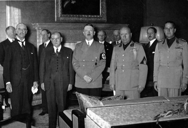 В 1938 г. население Чехословакии составляло 14 млн человек, из которых 3,5 млн были этническими немцами, компактно проживающими в Судетской области, а также в Словакии и Закарпатской Украине. Причем эти области никогда не входили в состав Германии, так как являлись частью Австро-Венгрии. Аншлюс Австрии дал Гитлеру повод поднять вопрос и о чешских немцах. Целью же его устремлений скорее была промышленность Чехословакии, в том числе и военная – одна из самых развитых в Европе. Она входила в число ведущих мировых экспортеров оружия, ее армия была отлично вооружена. Немецкие сепаратисты и нацисты Чехословакии во главе с Генлейном постоянно поднимали вопрос о притеснениях чехами этнических немцев. 22 мая 1938-го они сделали попытку превратить муниципальные выборы в плебисцит о присоединении Судетской области к Германии. Части вермахта выдвинулись к границе, однако и чехословацкие войска вошли в Судеты. Франция и СССР заявили о поддержке Чехословакии. Попытка отторжения Судетской области не удалась. Начались переговоры. Однако в начале сентября генлейновцы спровоцировали в Судетах беспорядки, и правительство Чехословакии вновь ввело в населенные немцами районы войска, объявив там военное положение. Генлейн сбежал в Германию. 22 сентября Гитлер выдвигает ультиматум: не препятствовать Германии в оккупации Судет. В ответ Чехословакия и Франция объявляют мобилизацию. 27 сентября Гитлер направляет Чемберлену письмо, в котором сообщает, что он не хочет войны, готов дать гарантию безопасности оставшейся части Чехословакии и обсудить детали договора с Прагой. 29 сентября в Мюнхене по инициативе Гитлера происходит его встреча с главами правительств Великобритании, Франции и Италии. Чехословацкие представители не были допущены к консультациям в ходе этого совещания. Отказали в участии и представителям СССР. 30 сентября 1938 г. Мюнхенские соглашения были подписаны Гитлером, Чемберленом, Даладье и Муссолини.
