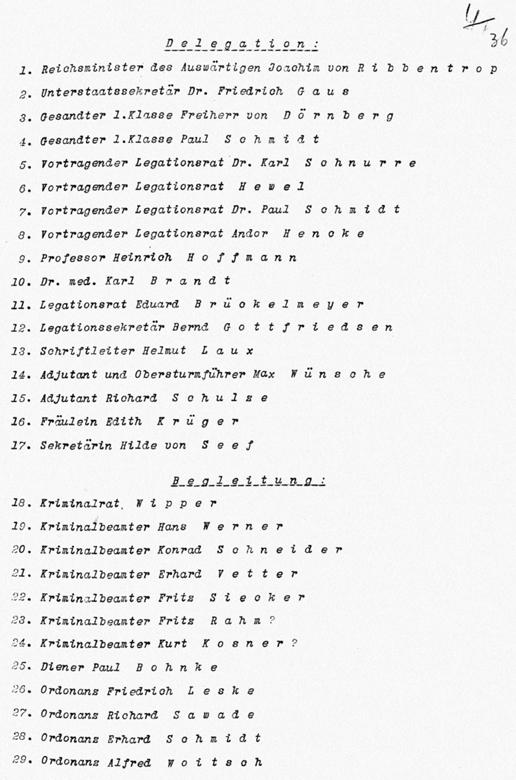 В составе делегации 38 человек, включая Риббентропа, эта цифра уже неоднократно называлась. Изучение списка показало, что из этих 38 человек 17 – официальные лица, 8 – сопровождающие (7 охранников и один камердинер), 4 – обслуживающий персонал и 9 человек – летный состав.