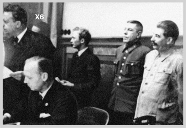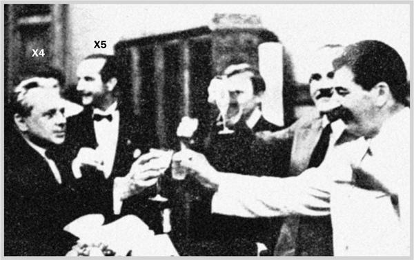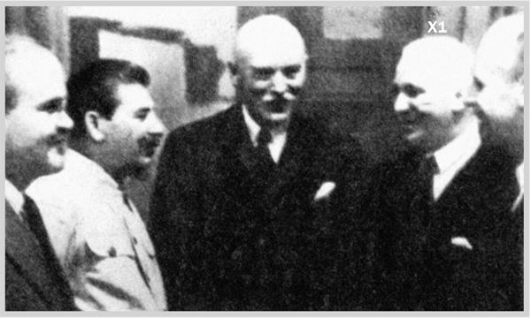 3. Человек с характерным крючковатым (возможно даже сломанным) носом участвует в той же беседе со Сталиным и Молотовым. В его правой руке листы бумаги и какой-то брелок. Почему-то его очень не хотели показывать раньше, и сейчас не спешат показать россиянам, поэтому почти полностью вырезали из снимка. Он помечен знаком X3 и весьма похож на К. Хаусхофера.