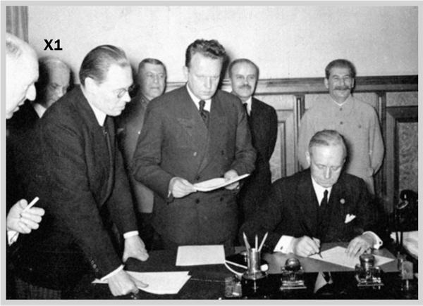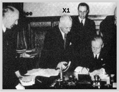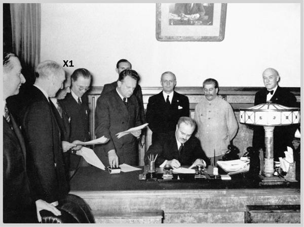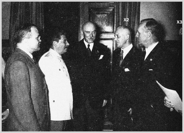 23—24 августа 1939 г. Один неизвестный (Х2) слева от Риббентропа, а справа видны нос и руки другого с листом бумаги и брелоком (Х3).