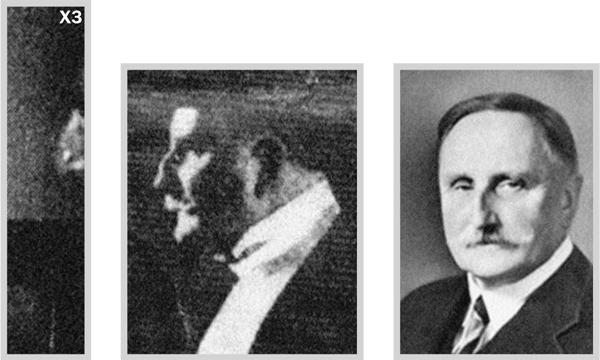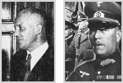 На левом снимке – увеличенный фрагмент лица человека, стоящего справа от Риббентропа (Х3) на предыдущем снимке, где видны только его нос и рука. На мой взгляд, это К. Хаусхофер, потому что именно он был идеологом создания континентального блока – «Оси». Листы бумаги и брелок в руках типичны для него, брелок – скорее это четки (он всегда тяготел к Востоку). На двух следующих фото – К. Хаусхофер, ученый-геополитик, учитель Гесса, автор многих идей книги «Майн кампф».