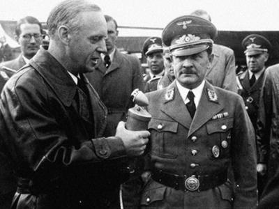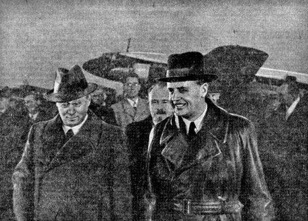 Кенигсберг. 27 сентября 1939 г. Перед вылетом делегации в Москву. На переднем плане Риббентроп и гауляйтер Восточной Пруссии Э. Кох. Сзади в фуражках два военных летчика, вероятнее всего, пилоты вылетающих самолетов: справа – Баур, слева – пилот второго самолета