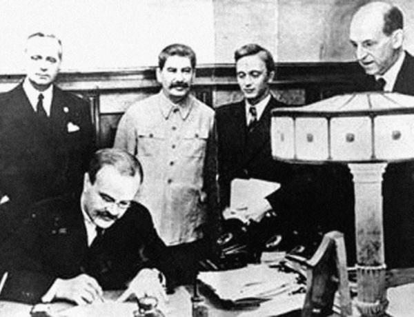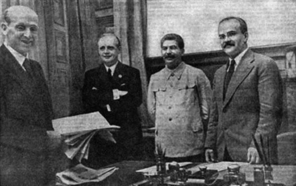 Вот единственный опубликованный тогда снимок августовской встречи. Он сделан фотографом М. Калашниковым 23 августа (точнее – ночью 24 августа) 1939 г. в кабинете Молотова сразу же после подписания советско-германского Договора о ненападении. Начальник юридического отдела МИД Германии Ф. Гаус гордо показывает его подписанные листы. Справа от него – довольные Риббентроп, Сталин и Молотов. Снимок был опубликован в «Правде» 24 августа 1939 г.