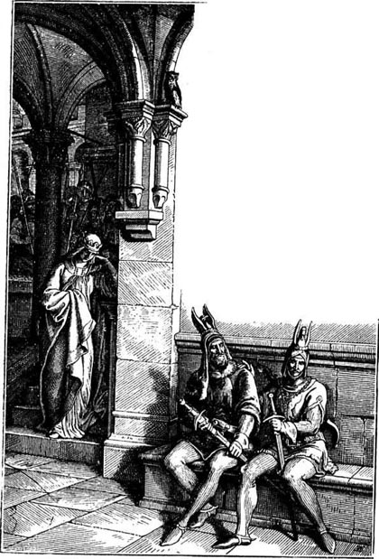 Видя всё это, Хаген на другое утро убеждает королей не снимать с себя оружия… В боевых доспехах короли-братья со свитой отправляются в церковь, и после службы между их служилыми людьми и гуннами завязалось было ссора, которая не обошлась без кровопролития. Но сам Этцель принял меры к тому, чтобы восстановить спокойствие между враждующими сторонами, и как-нибудь замять неприятное столкновение, поспешив пригласить Бургундских королей со свитою к себе на пир.