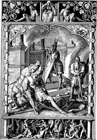 Но грозный Гельфрат сам пал от руки Хагена, и все войско баронов было рассеяно дружным натиском бургундцев.