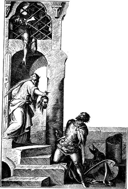 Видя бесплодность дальнейших расспросов, Кримгильда в изступлении отрубает Хагену голову мечом Сигфрида; а вспыльчивый Гильдебранд, возмущенный её злодействами, не может терпеть их долее – выхватывает меч и поражает им Кримгильду.