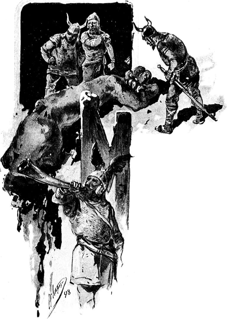 В Дании некогда правил так рассказывается в начале этого древнего сказания – славный род Скильдингов. Один из королей этого славного рода, по имени Хродгар, особенно счастливый в войнах с соседями и накопивший от этих войн большие богатства, задумал ознаменовать свое царствование достойным памятником. Он решился выстроить для пиршеств своей дружины такую залу, которой бы не было и не могло быть подобной во всем свете. Задумано – и сделано. Собрав отовсюду искусных строителей, Хродгар не пожалел ни труда, ни издержек на дорогую и громадную постройку, и здание это, как по внешней своей красоте, так и по внутреннему убранству, оказалось в самом деле бесподобным. И чуть только эта дивная, богато-, изукрашенная зала была закончена, Хродгар перешел в нее со своими витязями, и вся окрестность огласилась шумными кликами его пиршества, звоном дорогих чар, ковшей и кубков, и громкими песнями королевских певцов, которые услаждали пирующих, щедро награждаемые из королевской казны. Но – увы! – это шумное веселье длилось недолго: – недолго звучали в той дивной зале чары и кубки, недолго раздавались веселые песни и клики, недолго рекою лилось пенистое пиво и золотисто-прозрачный мед… Шум пиршеств короля Хродгара каждый вечер доносился по ветру в мрачное жилище страшного и громадного чудовища по имени Грендель, который, невдалеке от дивной залы Хродгара, укрывалось в обширных прибрежных болотах. Людское веселье тревожило Гренделя и возбуждало в нем непримиримую злобу… И вот, однажды ночью, это чудовище неслышно подкралось к зале Хродгара. Там после долгого и веселого пиршества расположились на ночлег беспечные сподвижники Хродгара… Грендель набросился на них среди сна, выхватил разом из их среды тридцать витязей и быстро повлек их с собою, в свое мрачное жилище, жадно терзая и пожирая их на пути.
