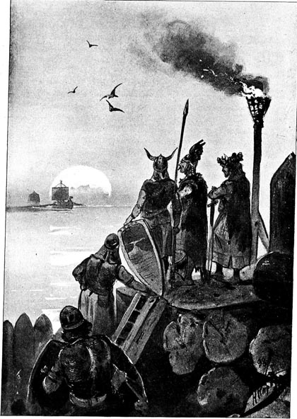 Слух об этом страшном бедствии распространился широко и далеко. Он донесся и в землю геатов, где жил в то время славный витязь Беовульф, знаменитейший из богатырей короля Хигелака. Он заявил королю своему о желании подать помощь престарелому королю Хродгару, вступив в борьбу с чудовищным Гренделем. Как ни старались старые и опытные люди отговорить его от такого благого намерения, он снарядил свой корабль к плаванию и отплыл к берегам Дании. С ним вместе поплыли на том корабле четырнадцать храбрейших воинов, избранных им из всей его дружины.