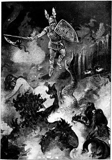 Целый день, с утра и до вечера опускался Беовульф на дно страшной бездны, среди чудовищ, которые яростно бросались на него и хватали зубами, то за плечи, то за руки, но их злобные нападения оказывались тщетными- всюду встречали они либо непроницаемо-твёрдую броню, либо частую сеть крепкой железной кольчуги. Когда же он наконец коснулся ногами дна этого страшного омута – на него тотчас же яростно набросилась мать Гренделя, самого страшного из всех водяных чудовищ. Охваченный могучими лапами чудовища, Беовульф не мог двинуть в воде ни рукою, ни ногою, не мог даже обнажить меча своего – а мать Гренделя, между тем, быстро увлекала его куда-то в сторону из мрачного омута. И вдруг он увидел, что они очутились в каком-то неведомом углу бездны. Беовульф убедился, что вода туда не проникала, что эта мрачная подводная пещера была освещена каким-то бледным светом, и тут только разглядел вполне ясно то чудовище, которое держало его в своих мощных когтях. Быстро оправившись, Беовульф встряхнул плечами, вырвался из лап чудовища и, выхватив меч Хрунтинг, яростно напал на своего грозного противника. Но увы! – крепкая, благородная сталь не могла нанести чудовищу никакого вреда и только скользила по его чешуе… Тогда Беовульф, отбросив opyжиe, вступил в борьбу с матерью Гренделя, сбил её с ног, но потом, поскользнувшись, сам упал, и чудовище навалилось на него всею своею тяжестью, пытаясь его раздавить или задушить. Но Беовульф был опытный борец: – улучив минуту, он выбился из-под чудовища, вскочил на ноги, сорвал со стены громадный меч, некогда выкованный древними великанами и, собрав все силы, с размаху ударил им мать Гренделя по шее… Затрещали хрящи и кости – все раздробил страшный меч, и бой окончился одним ударом. Обливаясь кровью, чудовище пало мёртвое к ногам Беовульфа.
