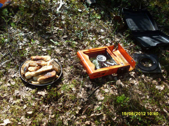 Отработали 2 точки учёта и перекусили. С собой в рюкзаках взяли чай, хлеб, колбасу и сыр. Был ещё паштет, но он как-то не пошёл. Видать сказывается начало командировки, ещё не оглодали на вольных хлебах, после домашней кормёжки.