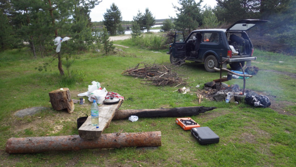 Место здесь такое. Сосновый мыс, вокруг вода, на мысу несколько сосен, у костровища сделан столик и сиделки из тонких брёвнышек. Место открытое, поэтому комариков сдувает. Поели и отдохнули, ну, а там и собираться стали, ведь нам ещё предстояло ехать до посёлка Муезерский, и хоть он вроде и недалёко (30 км), но дорожка там грунтовая, ну очень весёлая в ямках и буераках.
