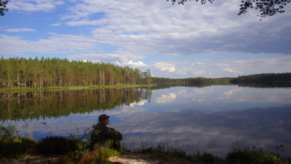 Что есть первичное? Естественно физиология, вылез из спальника, открыл молнию в палатке на москитной сетке, комарики обрадованно загудели у головы пытаясь укусить шею. Полусонно мотнул головой, руки машинально нашарили тапки и одели их на ноги. Пальцами правой руки нашел бегунок молнии от верхнего тента палатки и плавно потянул вверх, наконец-то вылез, всем здрасьте. На биваке тишь да благодать, Володьки нету, может в лесу, может на озере, где-то бродит. Пока окидываю взором быстро движусь к заветной сосёнке, ух, хорошо. Гидробудильник отзвенел, первая радость в организме наступила. Свежий ветерок дует с озера, поесть или умыться? Костерок дымит, уже остались одни угли и два крайних брёвнышка (о разведении костра написано столько, что опишем подробнее в следующий раз), меж брёвнышками угли подёрнулись пеплом, сверху висит наш закопчённый котелок, в нём вода для чая или кофе. Ага, значит Володька где-то рядом. Дужка котелка немного обжигает ладонь, наливаю в кружку воды, бросаю туда чайную ложку растворимого кофе и три ложки сахара. Вот теперь в руке есть нечто утренне-горячее, на столике лежит полбуханки чёрного хлеба с неровным краем, отрезал финкой половину ломтя. В голове появляется мысль о том, что всё-таки финка хороша и нет нужды в покупке новой, крутой и дорогой, какую видел в прошлом году в г. Кеми у Иванова Владимира Фёдоровича. К тому же, точно такую же купил этой весной на рыболовной ярмарке в Петрозаводске.