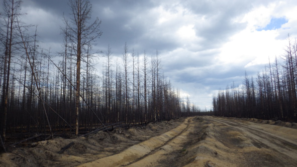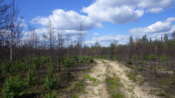 Вчера осваивал нижнюю 4 ветку, дорогу, идущую на посёлок Лендеры. Перешёл через реку Кожала по брёвнышку, а потом в небольшой заход, всего несколько выделов, но объёмные по площади, причём много устоявшего леса, шёл низовой пожар. Вот и отсекал в натуре для точности, район погибшего леса для назначения СОМ (в данном случае УЗ).