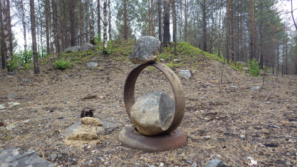 Нашёл два чугунных колеса-обода не очень понятного использования. Сделал знак на перекрёстке, он простоит ещё много лет, мне на память, другому на удивление. Один обод положил на землю, другой поставил на попа, вовнутрь получившегося круга, и прижал камнем с внутренней стороны, для устойчивости конструкции.