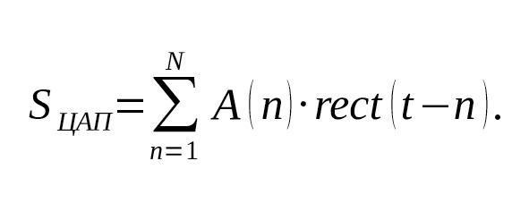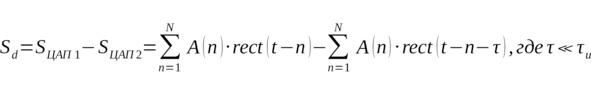 Временное представление физического сигнала обычно представляет собой не сумму функций Кронекера δ (t-n) с некоторыми амплитудами A (n): В действительности, современные ЦАП могут выдавать разные функции, но сигнал на выходе ЦАП можно записать в виде суммы прямоугольных функций rect (t-n): Для приведения сигнала к виду функций Кронекера предлагается использовать два устройства ЦАП, незначительно рассинхронизованных по фазе: ЦАП 1 и ЦАП 2 (сигналы на выходе SЦАП1 и SЦАП2). Рассинхронизация по фазе отражена на рис. 1.6 с помощью задержки цифрового сигнала на величину τ. Полученные сигналы взаимно вычитаются с помощью аналогового сумматора со знаком минус:, то есть задержка τ мала по сравнению с длительностью прямоугольного импульса. Таким образом, спектр сигнала Sd содержит множество высших гармоник, слабо затухающих по sinc-функции. И эти гармоники фильтруются согласованным фильтром СФ, настроенным на требуемый частотный диапазон k. fd. В результате чего получается низкочастотный сигнал SА, полоса которого содержит несколько спектров изначально сгенерированного сигнала S.