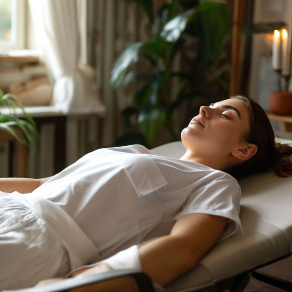 На кушетке в кабинете психотерапевта-массажиста