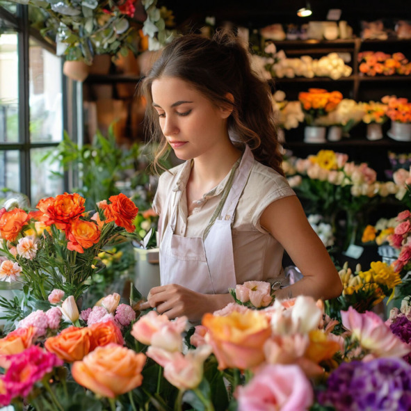 Продавщица цветов в цветочном ларьке
