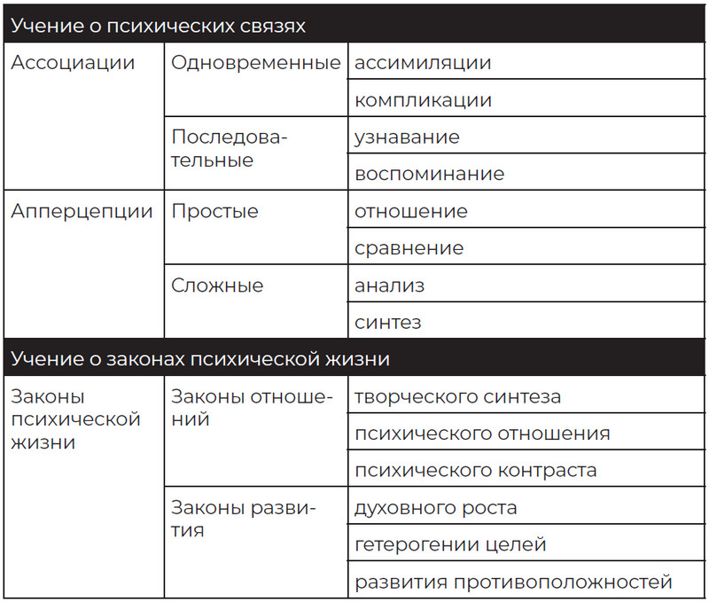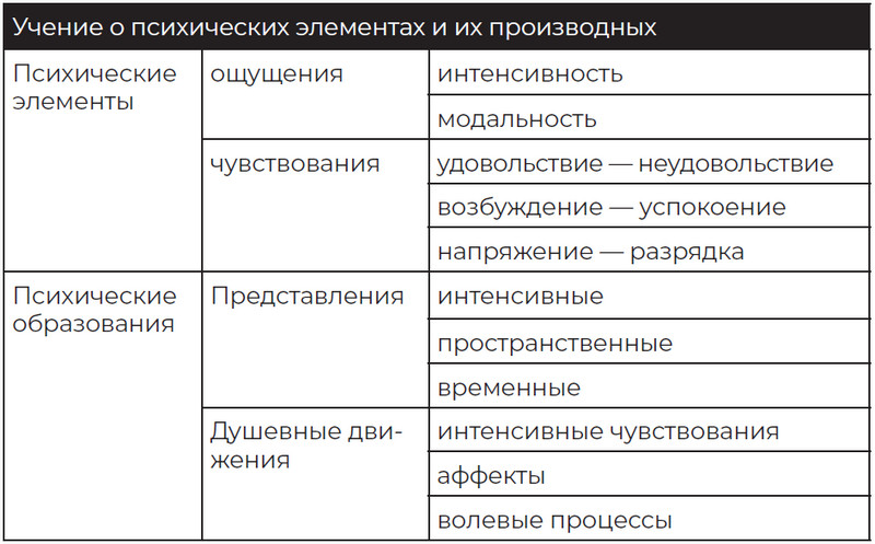 Как и у Гегеля, система Вундта включает три основных части: учение о психических элементах; учение о связях между этими элементами и продуктах этих связей; и учение о происхождении и законах психической жизни (табл. 1.2).