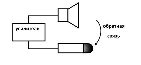 Звук самовозбуждения возникает на определенной частоте. Период колебаний равен времени, которое необходимо, чтобы звуковая волна дошла от громкоговорителя до микрофона. То есть период колебаний должен быть равным расстоянию от источника до приемником звука. При этом возникает резонанс. Дополнительное условие самовозбуждения: коэффициент усиления должен компенсировать ослабление звука при движении по воздуху.