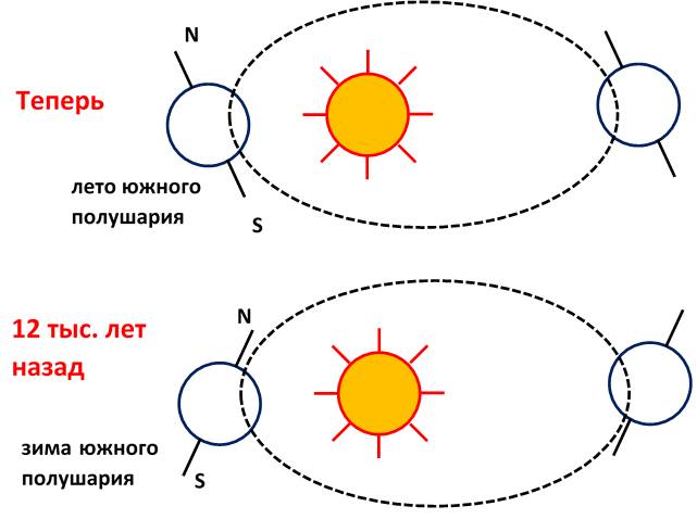 Сербский астрофизик М. Миланкович обратил внимание, что существует механизм, который с периодичностью 25 тысяч лет меняет освещение Солнцем южного полушария. В основе работы этого механизма лежат две особенности движения Земли по своей орбите, рис.17.