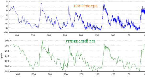 Рис.18. Изменения температуры (синие линии) и концентрации углекислого газа (зеленый цвет), Википедия
