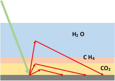 Рис.19. Схема действия парниковых газов, зеленая стрелка – видимый солнечный свет, красные стрелки – инфракрасное излучение
