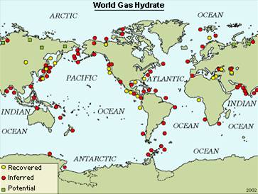 Поиск метан-гидратов по всей нашей планете привел к выводу, что дно океанов в настоящее время является хранилищем огромных количеств метана. Его возможным источником послужили реки, которые в течение сотен тысяч лет сбрасывали в океан органические остатки. Их гниение на глубине, превышающей 250 метров, приводило к формированию слоев метан-гидрата.