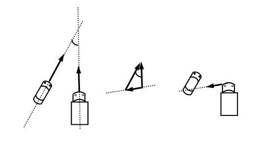Чтобы выполнить такую операцию, необходимо прейти в такую систему отсчета, в которой из скоростей всех тел вычитается скорость автомобиля vлегк. Вычитание можно произвести графически, так, как изображено на рис. «в». Направление и величину новой скорости относительного движения можно найти, произведя векторное вычитание vотн = vгруз – vлегк , изображенное на рис. 9б. В результате приходим к картине движения, представленной на схеме 9в. На нем легковушка покоится, а движется лишь грузовик. Видно, что новая, «относительная», траектория грузовика пересекает силуэт его соседа. Столкновение произойдет! Левая точка переднего бампера грузового должна ударить в заднюю часть правого крыла легкового автомобиля.