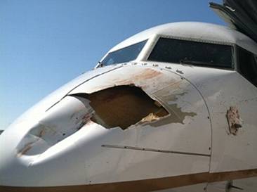 Ответ. Оказывается, может. Действительно, на аэродромах существует подобная острая проблема. Птица может повредить летящий самолет, благодаря сложению их скоростей. Таким образом, импульс тела – величина относительная. На рис.8 изображен результат подобного столкновения, произошедшего в Международном аэропорту Денвера, США 31 июля 2013 года. Согласно данным сайта birdstrike.org, столкновения с птицами наносят ущерб гражданской и военной авиации США на сумму свыше 600 миллионов долларов ежегодно. В частности, в Бразилии, за год фиксируют более 500 столкновений пассажирских самолетов с птицами.