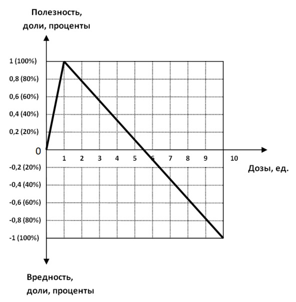 нормальная доза снотворного препарата «Феназепам» составляет от 0, 5 мг до 1 мг (0, 5 – 1 таблетка по 1 мг) за 20—30 мин перед сном. Однократное же употребление 10 мг препарата (10 таблеток по 1 мг) приводит к летальному исходу. Первое отношение удовлетворения потребностей соответствует величине «+1» (»+100%»). Второе – величине «-1» (» -100%»). Отношение бесполезности соответствует не употреблению таблеток вообще. Эти отношения человека к снотворному, его полезности и вредности можно наглядно представить на соответствующем графике (см. рис. 3). На этом графике видно, что кривая (представлена, ввиду отсутствия у автора данных о фактической «кривизне» линии полезности, прямыми линиями, образующими ломаную линию) имеет явно выраженный «пиковый» характер в точке, соответствующей максимальной полезности одной дозы (одной таблетки), и длинный участок понижающейся полезности вплоть до полной вредности (смертельной опасности) 10-ти доз.