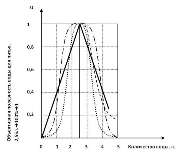 Но такой характер пиковости линии объективной полезности присущ не только этому, как может показаться, исключительному объекту потребления. В работе «К реабилитации теории потребительского поведения» автор привел график объективной полезности воды для человека, построенный на основании данных о полезности недостающего количества и вредности избыточного количества воды для человека, приведенных на ресурсе: http: //www.family-voda.ru/main/.