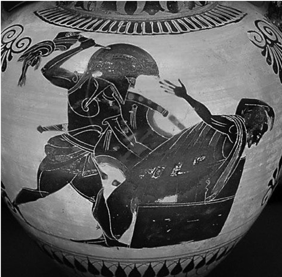 Здесь образ яростного героя сразу бледнеет: Ахилл раздумывает, не выхватить ли меч и не убить ли Агамемнона прямо сейчас – вместе с его охраной. Но отступает. Мифология смягчает удар по целостному образу: оказывается, у богини Афины на счет Ахилла другие планы, и она (невидимая окружающим) одергивает своего подопечного за волосы. Здесь Афина – это внутренний голос Ахилла, его разумность и расчетливость.