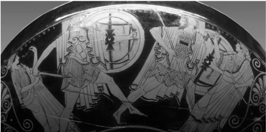 Следует предположить, что Менелаю тоже досталось от Париса – причем, в тот самый момент, когда он уже торжествовал победу. Дело в том, что Парис в ходе схватки не воспользовался мечом – о мече Париса ничего не сказано, а что он у него был, нет никаких сомнений. Именно этим мечом Парис мог нанести Менелаю такой же удар по шлему, который получил сам. И оглушенный Менелай потерял из виду своего противника, который отступил к рядам троянцев. При этом Менелай был уже безоружен: его копье застряло в щите Париса, его меч разлетелся в куски при ударе о шлем противника. Парис был оглушен и потерял шлем, но и Менелай был оглушен и безоружен.