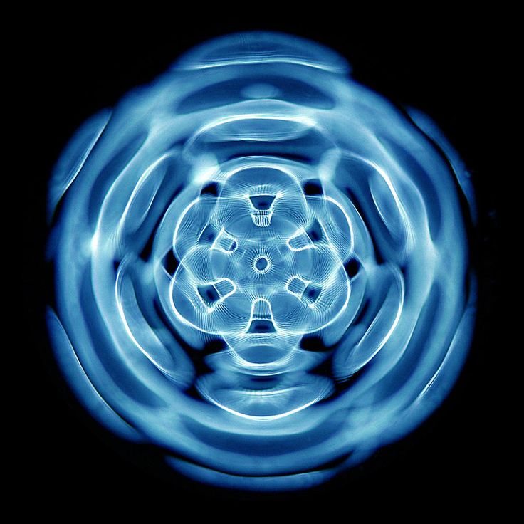 Тут можно четко увидеть, что волны расходятся шестиугольником, а капля в момент достижения положения равновесия стремится принять сферическую форму, которую она имеет и в невесомости.