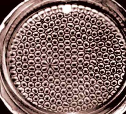 Ячейки Бенара – обратите внимание на образование из шести капель чуть слева от центра – эта структура явно выделяется на общем фоне, и наверняка играет особенную роль. Вода имеет ровно ту же самую форму своей молекулы в напряженном состоянии, что и рисунок на Сатурне – И причина наличия именно этой формы повсеместно – наверняка общая, как для самой среды, так и для всех её внутренних тел.