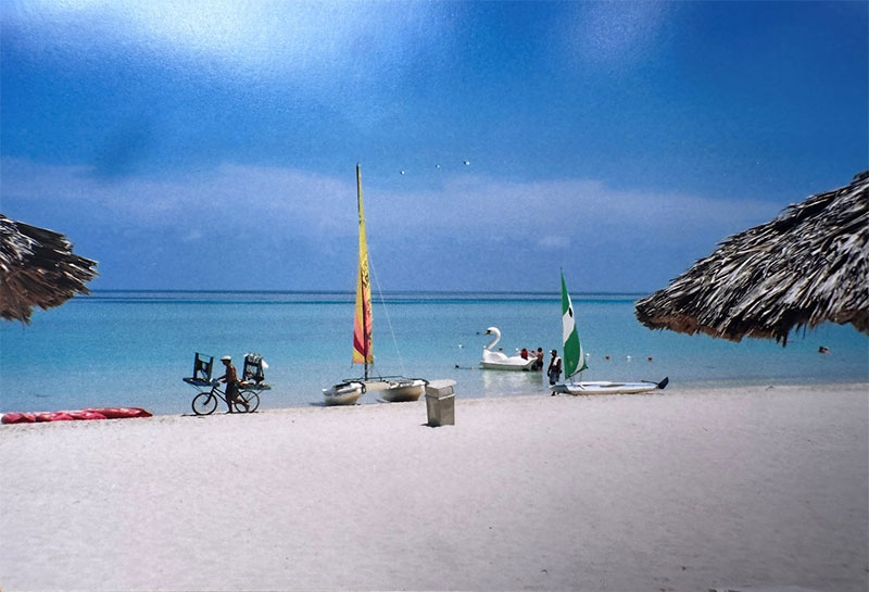 Ну вот быт наконец наладили, и мы начали осваивать пляж. Пляж – как пляж. Что мы пляжей разных не видели? А кубинские, да ещё в Варадеро они почти все идеальные. За рядом наших отельных бунгало тянулась тонкая полоса стройных пальм и мангровых кустарников и сразу начиналась пляжная полоса с исключительно белым мелким песком. Нам надо было только пройти в охраняемую зону нашего пляжа, где как говорится кипела пляжная жизнь. А если выйти сразу на пляж напротив нашего бунгало, то там был ровный берег без навесов и топчанов, зато можно было посидеть на песке в гордом одиночестве мечтая о чём-нибудь хорошем, когда приспичит конечно, и, если не потревожит проходящий от отеля к отелю торговец местными сувенирами.